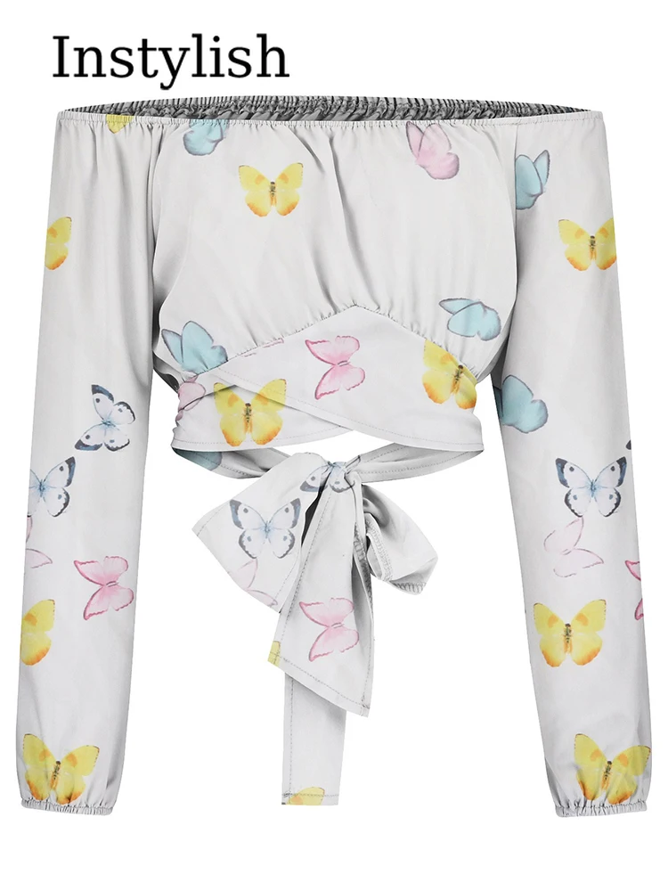 Blusas elegantes de manga larga acampanada con cordones y lazo, Tops cortos informales ajustados, 2023